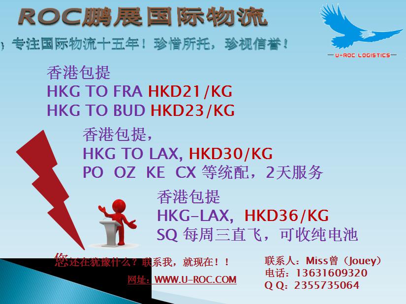 ROC--鵬展強烈為您推薦如下幾條空運渠道,價格無敵,服務第一,時效穩定 ![]() ![]() 如果確認過眼神,您確認是對的價格,就麻煩拿上您的手機,點開QQ或者手機號碼,盡情撥打吧~ |