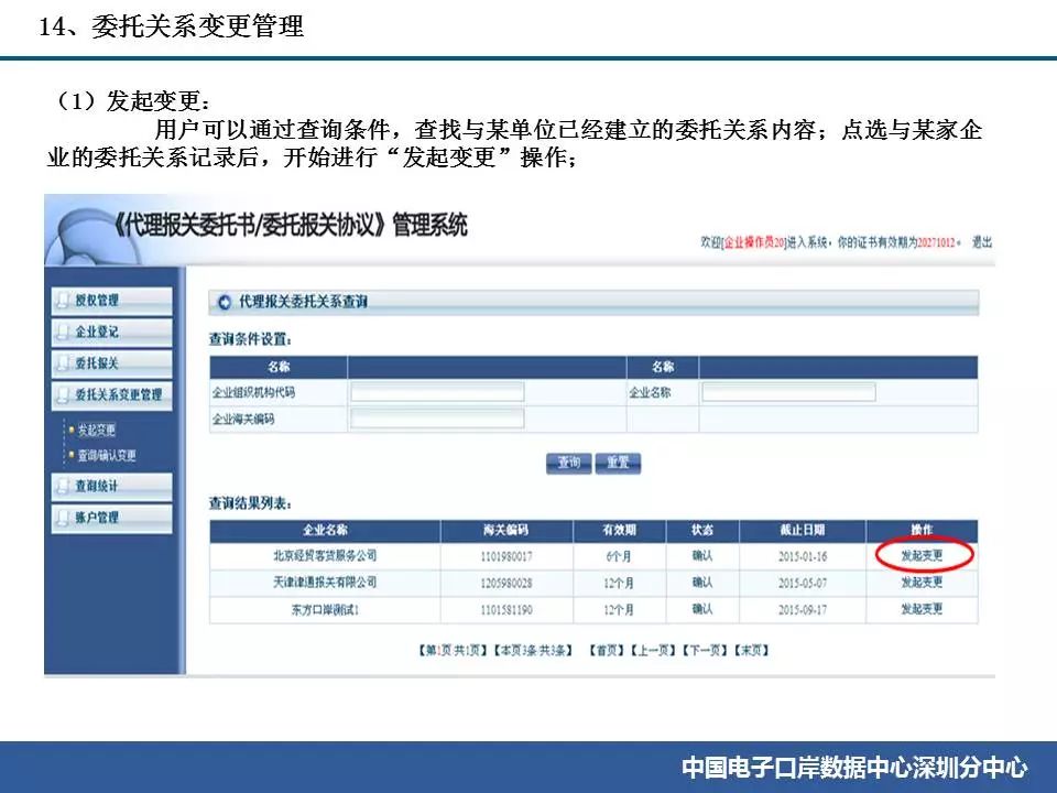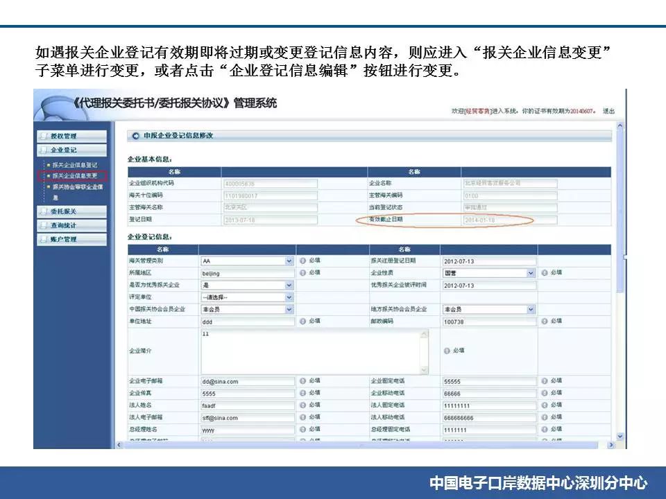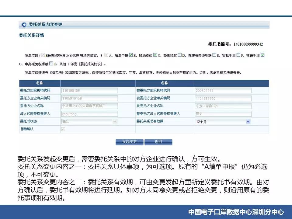 (1)在電子口岸端辦理變更業務后,已生效的委托書內容不會自動更新為新的信息,直到委托書過期。經與數據中心確認,該情況不會影響企業的代理報關委托業務。 (2)報關企業可以在“報關企業信息變更”菜單中修改信息后向報關協會申報并等報關協會審批。