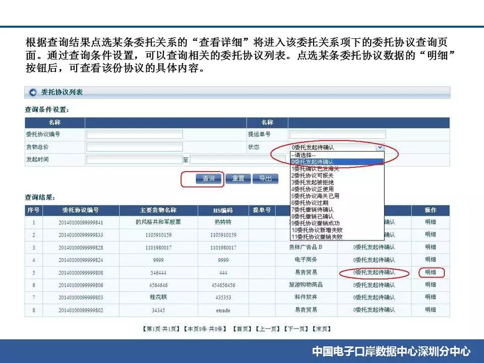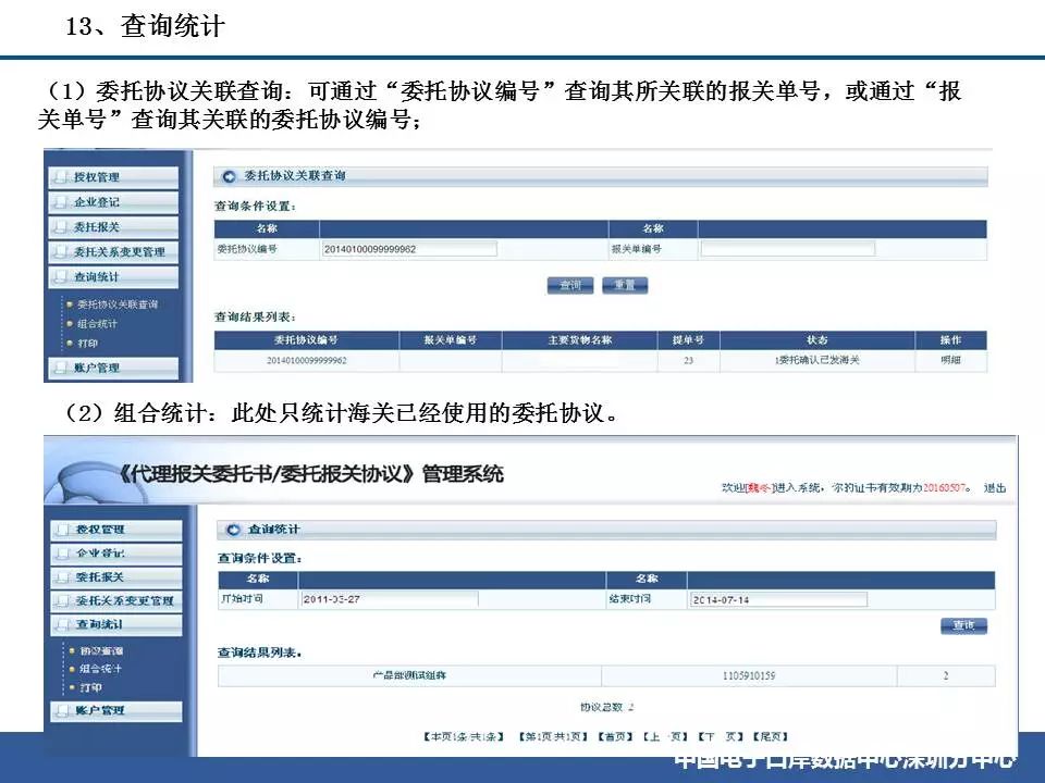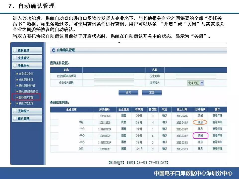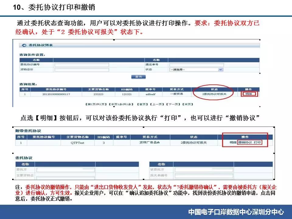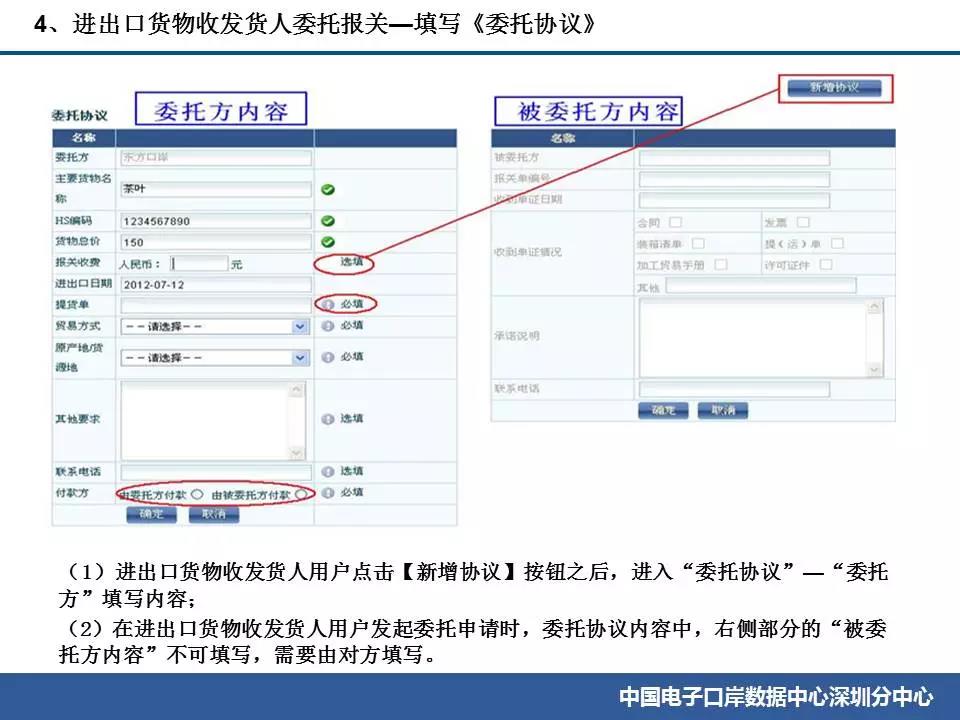 ![]() ![]() ![]() ![]() ![]() ![]() ![]() ![]() ![]() ![]() ![]() ![]() ![]() ![]() ![]() ![]() ![]() ![]() ![]() ![]() ![]() ![]() ![]() ![]() ![]() ![]() ![]() 常見問題(1)企業先完成簽訂委托協議,由系統生成委托協議編號。 (2)企業進行報關單無紙化申報時,需要出具委托協議的,在隨附單證上傳時填寫委托協議編號。 (3)海關H2010系統根據報關單中的委托協議編號,查詢該委托協議的電子數據中,進出口貨物收發貨人(委托方)、申報單位(被委托方),是否與報關單中的經營、申報單位一致。如一致,則視為通過。如果海關H2010系統沒有該委托協議號或委托協議編號被重復使用,會被退單。 (4)海關審批報關單通過了,系統就會把報關單編號自動反填在上傳的這份委托協議上。企業在查詢海關已經使用的委托協議的時候,可以在委托協議內容中的“被委托方”部分,看到報關單號碼。